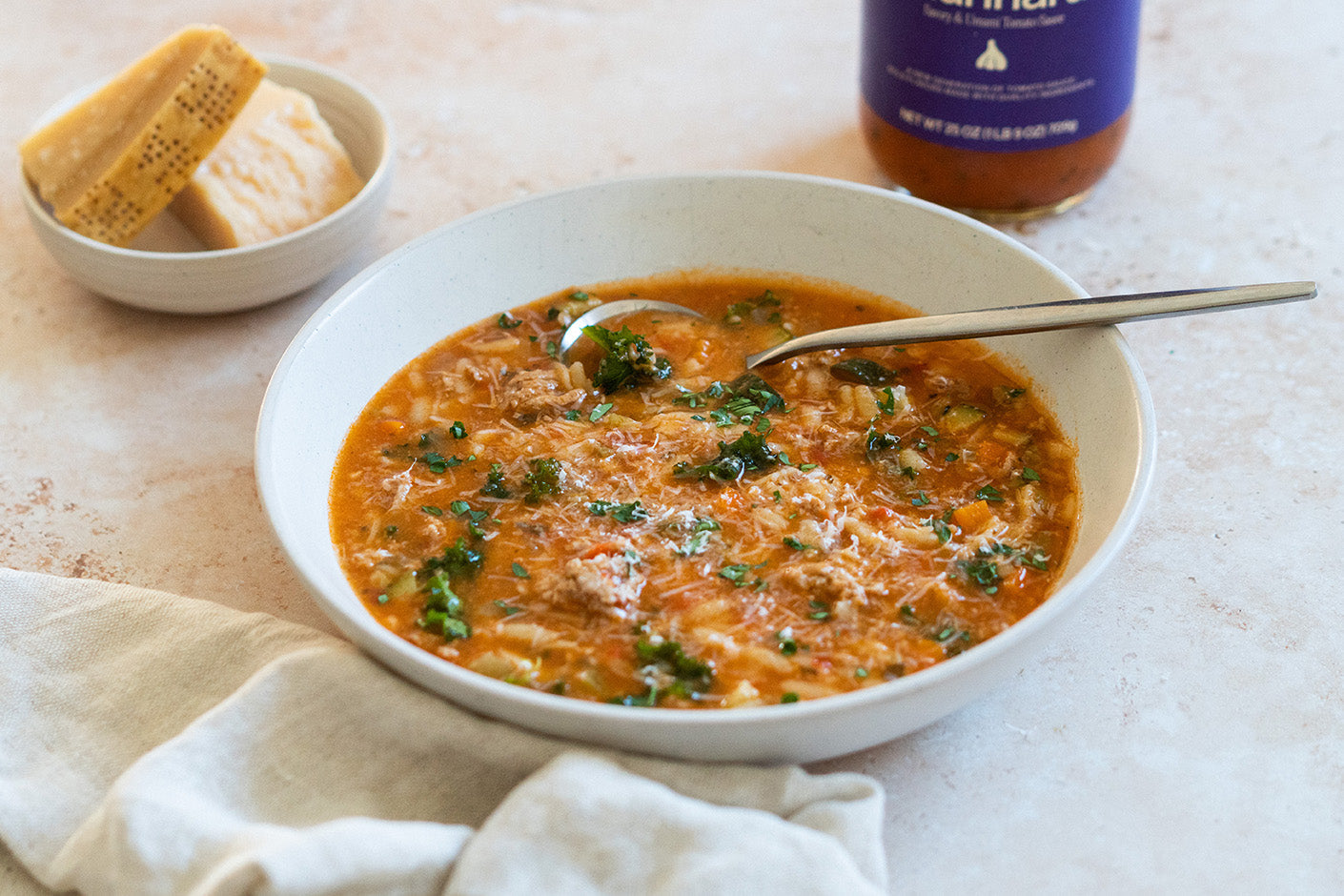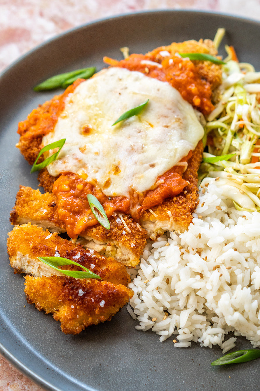 Japanese katsu meets classic American-Italian chicken parm. Crispy fried chicken is the perfect vessel for our Miso Garlic Marinara, and pairs perfectly with a fresh, tangy cabbage slaw. This dish takes a little bit of work, but is sure to impress your dinner guests, and makes for some pretty tasty sandwich leftovers.